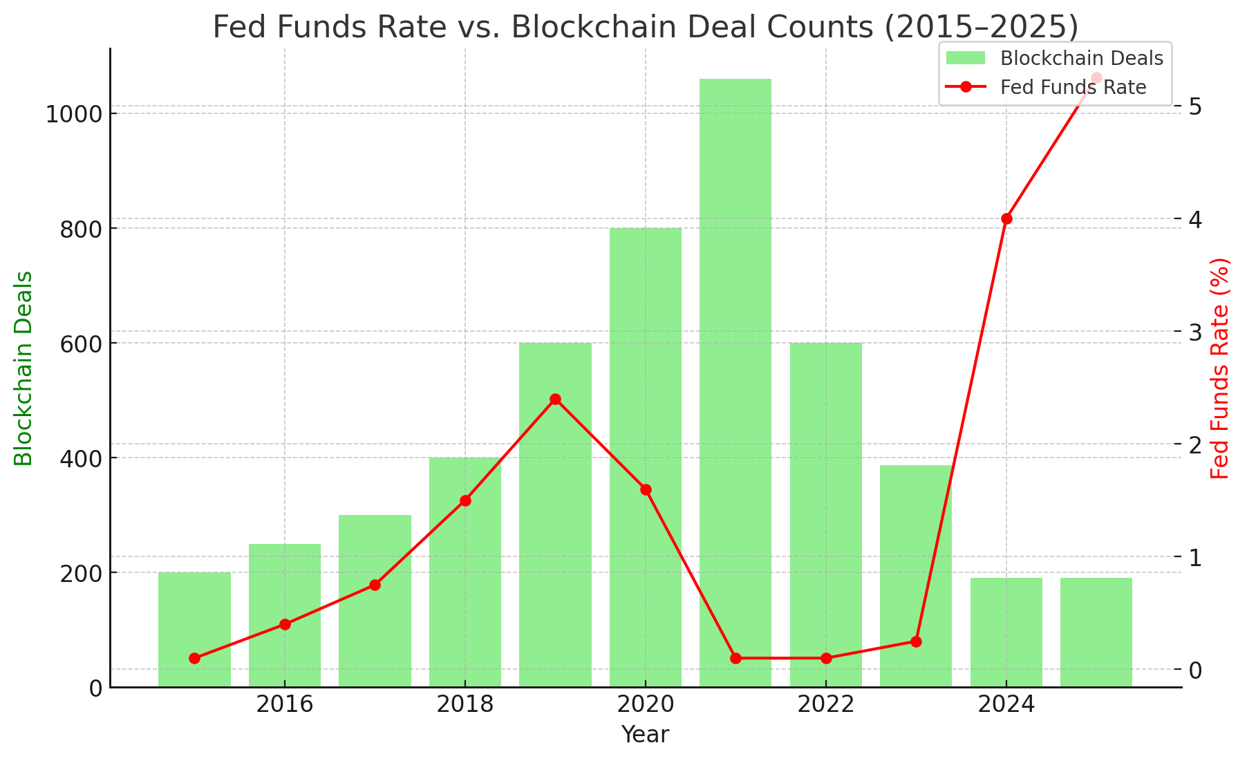 - 2022 to 2023: The Fed raised rates from 0.25 percent to over 5 percent at the fastest pace in decades. Deal counts collapsed. Blockchain fell from 1,060 deals in 2022 to 387 in 2024.